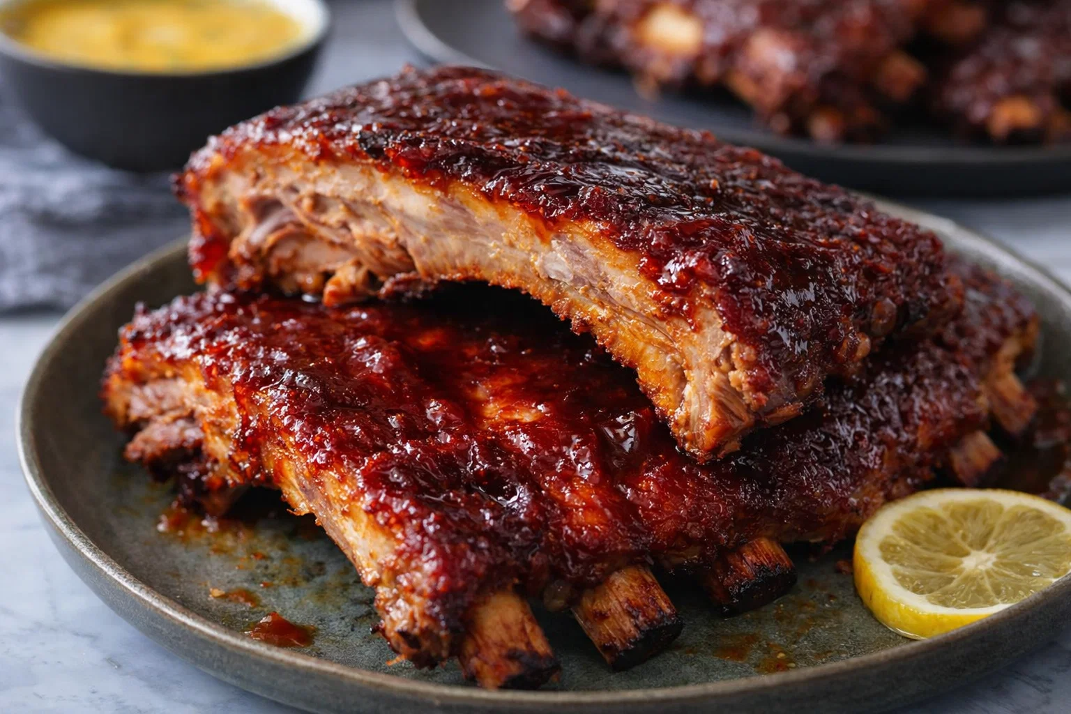 9. Serve: Slice the ribs into individual portions, plate them up, and serve with additional BBQ sauce on the side. Pair with sides like coleslaw, baked beans, or corn bread to complete the meal.