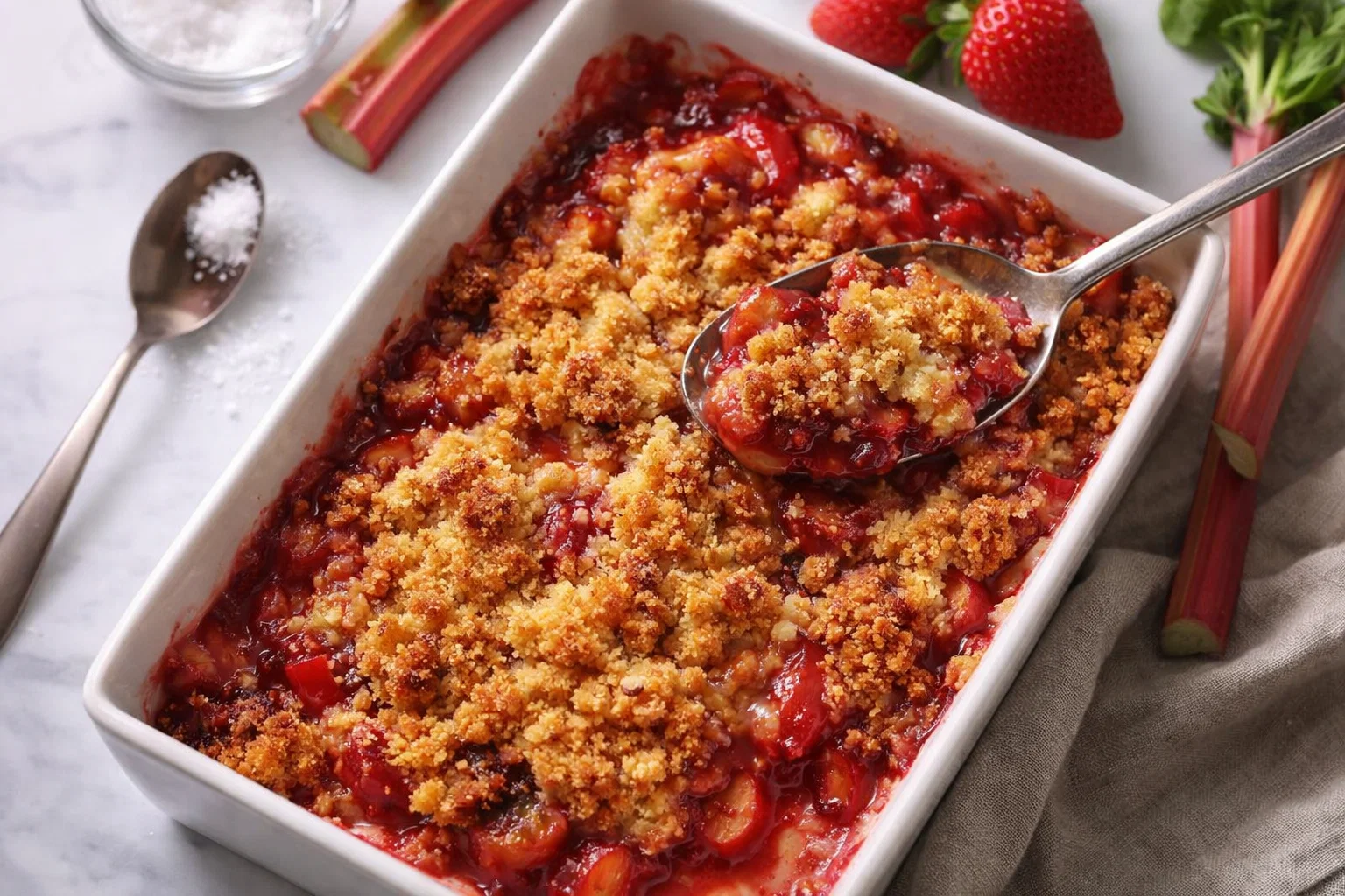 6. Bake: Place the dish in the preheated oven and bake for 30-35 minutes or until the top is golden brown and the rhubarb is bubbling.