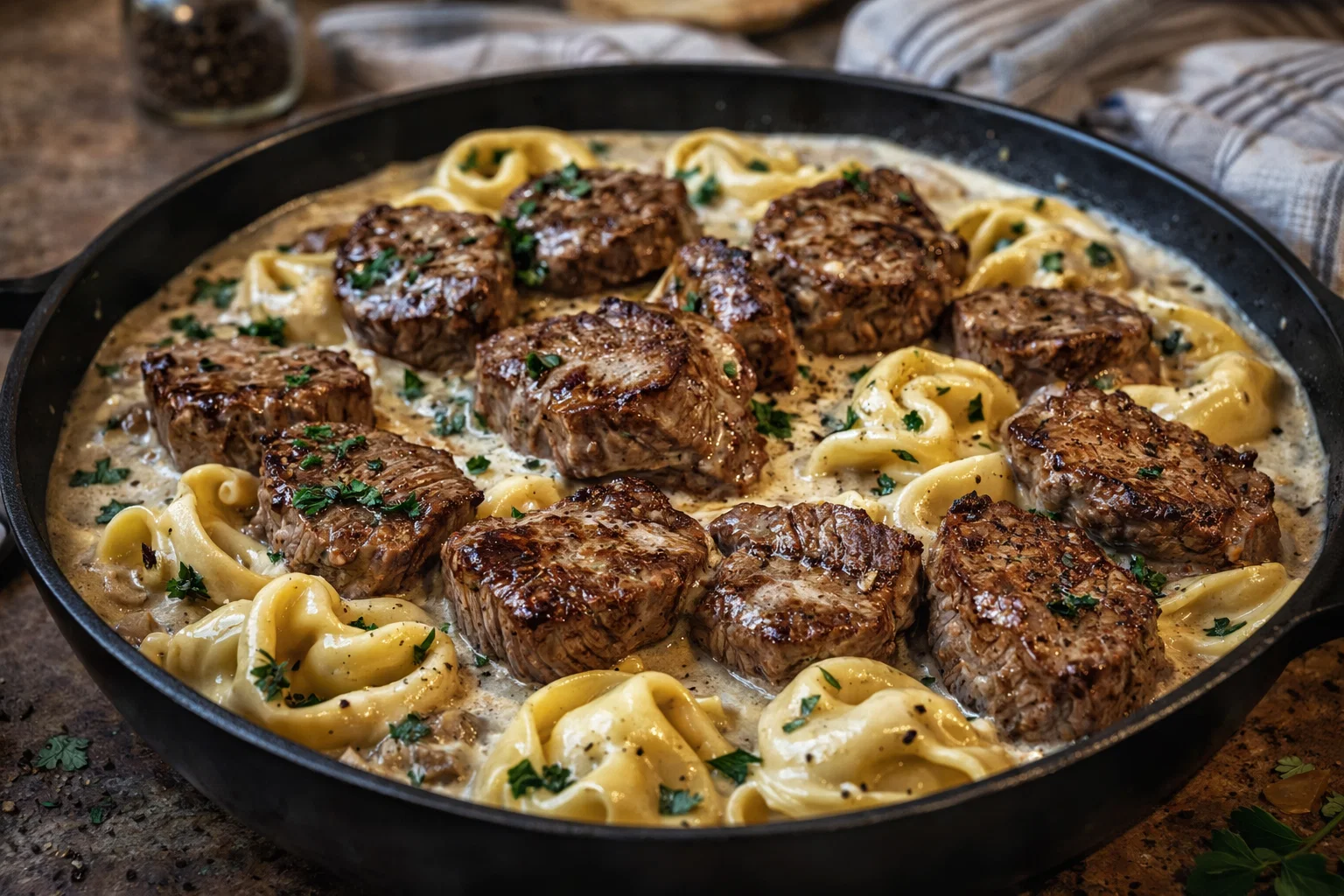 Combine Tortellini and Steak Mixture: Gently fold the cooked tortellini into the skillet, mixing everything together. Ensure that the tortellini is well-coated in the savory juices. If desired, adjust seasoning with additional salt and pepper.